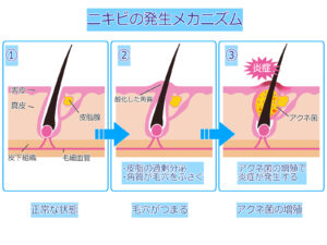 ポイントは、「皮脂」「毛穴のつまり」「アクネ菌」です。